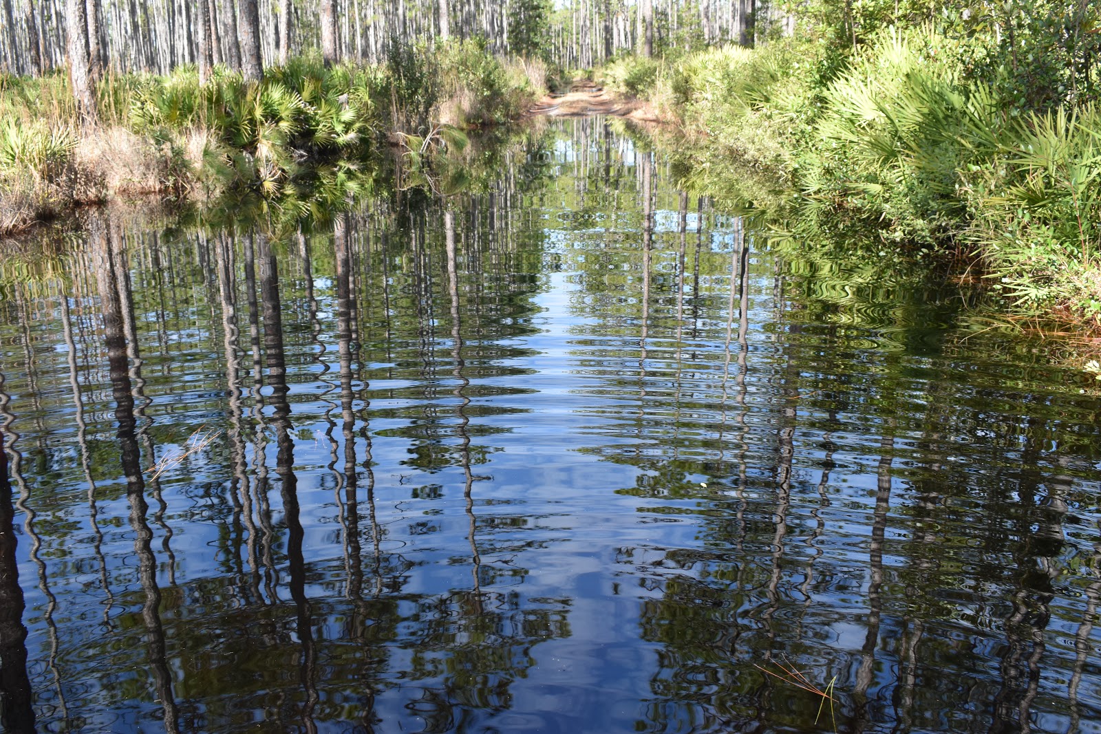 The forest itself was really pretty to walk through, despite the water issues. It was dense with pines (dense for Florida) and blanketed with green palmettos. Add in a blue, sky and it made for a pretty morning.